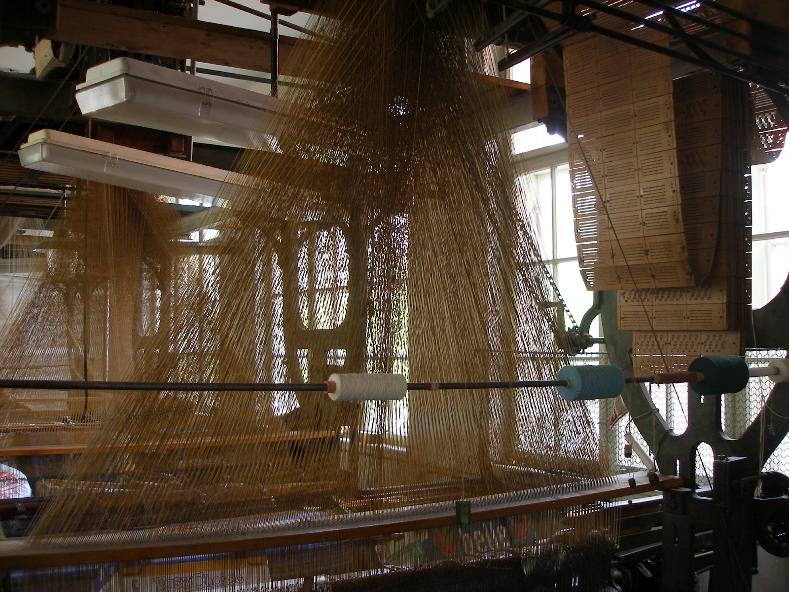 There are giant automated looms nearly two stories high, loaded with wide arrays of warp threads and long strips of complex punch cards encoded with the patterns for rugs and blankets.
